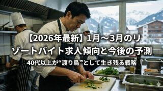未分類 【2026年最新】1月〜3月のリゾートバイト求人傾向と今後の予測|40代以上が“渡り鳥”として生き残る戦略