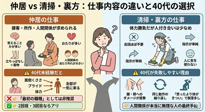 どちらも40代未経験には楽ではありませんが、立ち仕事がつらい人は仲居が、動き続けるのが苦手な人は清掃がきつく感じやすいかもしれません。