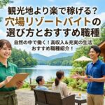 ![]() >>>アルファリゾート | ・温泉地や旅館など、落ち着いた雰囲気の職場で働きたい人におすすめ ・リゾートバイト経験者向けの特典やキャンペーンが充実しています ・高時給案件と仲居などのホテル、旅館業に強み。 アルファリゾートの体験談、アルファリゾートの登録方法 |